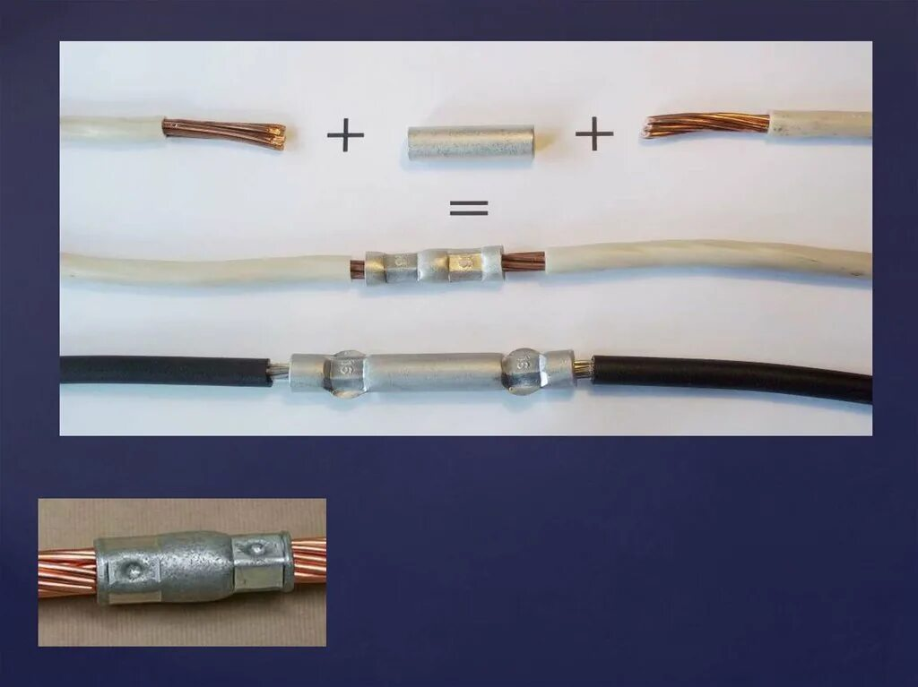 Несложный, заодно надёжный вариант, для которого недостаточно гильз, понадобятся пресс – клещи, также термоусадочная трубка, что создаёт герметичность месту соединения. Неразъёмный механизм одноразового типа, при ремонте следует отрезать и выполнить опрессовку заново с другой гильзой.
