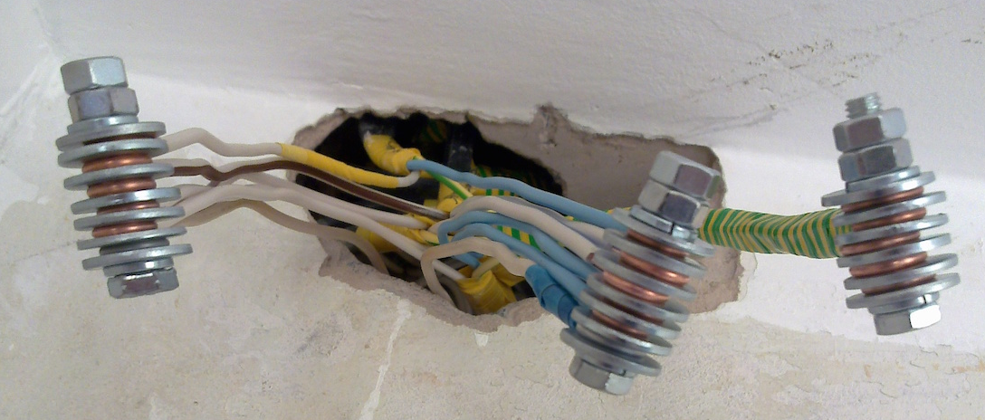 Тоже простой и многоразовый вариант, понадобится болт обычный, 3 шайбы к нему и гайка. Вариант соединения подходит при отсутствии материалов для применения любого из вышеописанных аналогов. Сначала на болт накручивается до конца шайба, следом зачистив жилу одного кабеля, накрутить сверху и установить 2 шайбу. Сверху – жила второго провода и последней идёт 3 шайба, после которой плотно закручивается гайка. Позволяет соединять концы медных проводников с такими же алюминиевыми.